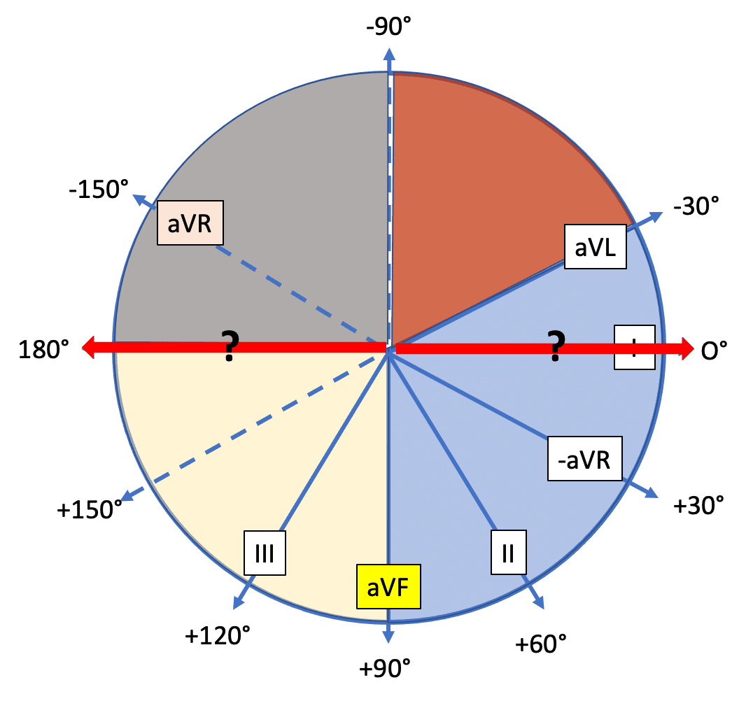 Är till exempel avledning aVF isoelektrisk, går QRS-axeln 90° mot avledning aVF, men om du endast tittar på denna avledning vet du inte åt vilket håll energin går, vektorn kan gå direkt mot 0° eller mot 180°.