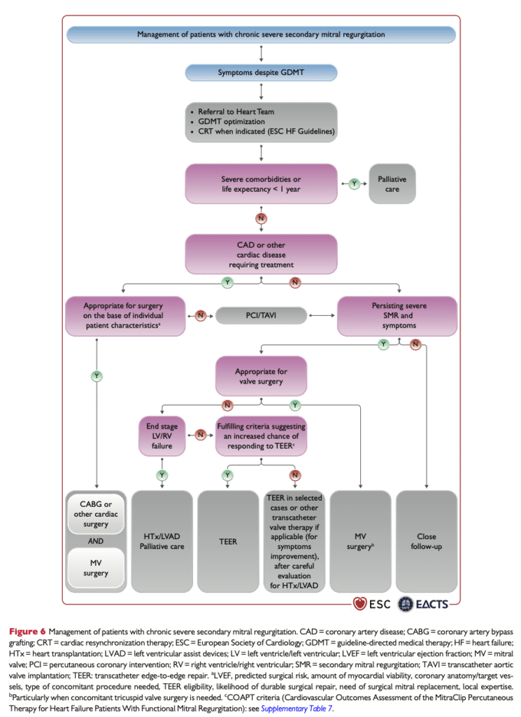 - Vahanian A, Beyersdorf F, Praz F, Milojevic M, Baldus S, Bauersachs J, Capodanno D, Conradi L, De Bonis M, De Paulis R, Delgado V, Freemantle N, Gilard M, Haugaa KH, Jeppsson A, Jüni P, Pierard L, Prendergast BD, Sádaba JR, Tribouilloy C, Wojakowski W; ESC/EACTS Scientific Document Group. 2021 ESC/EACTS Guidelines for the management of valvular heart disease. Eur Heart J. 2022 Feb 12;43(7):561-632. doi: 10.1093/eurheartj/ehab395. Erratum in: Eur Heart J. 2022 Feb 18;: PMID: 34453165. [↩] [↩] [↩] [↩] [↩] [↩] [↩] [↩]